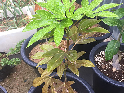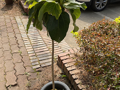 잎은 호생하며 길이 10-20㎝의 난형 또는 타원형이고 톱니가 없거나 3~5개로 갈라지며 첨두이고 예저 또는 넓은 예저이며 양면에 털이 없고 엽병은 길이 3-10cm로서 표면이 편평하거나 홈이 있다. 전체적으로 광택이 좋다. |