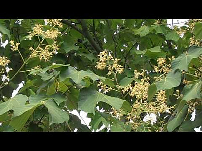 잎은 호생하지만 가지 끝에서는 총생하고 끝이 3-5개로 갈라지며 길이와 나비가 각 16-25cm이고 열편은 넓은 난형이며 점첨두이고 밑부분이 심장저이며 양면에 털이 없으나 뒷면에 짧은 털과 맥액에 갈색 밀모가 있는 것도 있고 가장자리가 밋밋하며 엽병이 잎보다 길고 맥이 뚜렷하다. 오동잎과 비슷하다. |