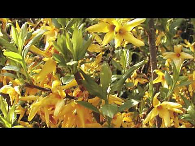 꽃은 엽액에 1~3개씩 달리며, 소화경의 길이는 5~6mm 정도 된다. 꽃잎은 종모양 4개로 중간부터 갈라지며, 꽃받침은 4개로 갈라지고 녹색이며 털이 없고 화관은 길이 1.5-2.5cm로서 깊게 4개로 갈라지며 열편은 긴 타원형이다. 꽃은 4월에 밝은 황색으로 피어 화창한 봄풍경을 조성한다. 수술은 화통에 달리고 2개로서 암술보다 길거나 짧으며 암술대도 긴 것과 짧은 것이 있고 꽃밥은 길이 2mm정도이다. | |