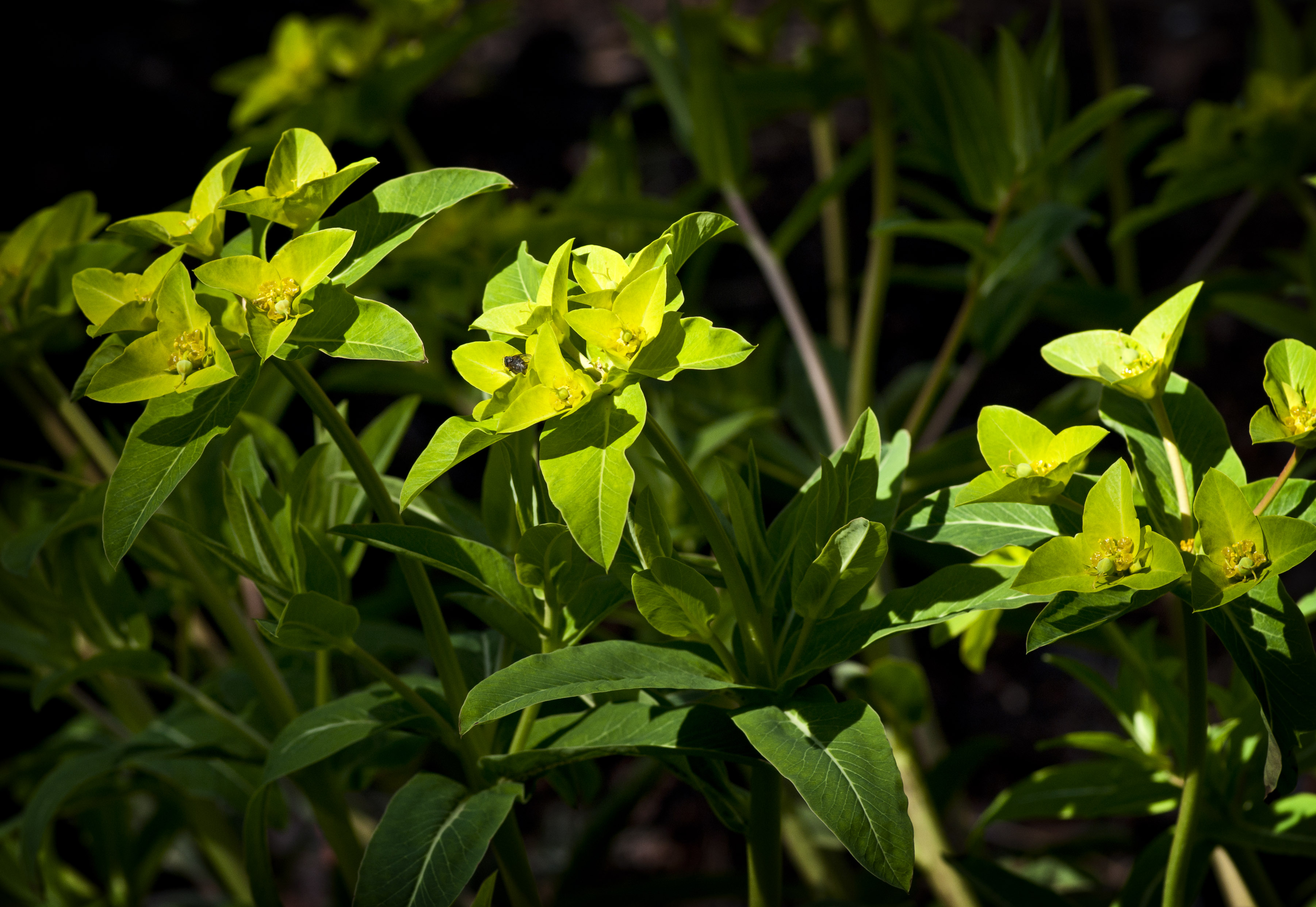 꽃은 5-6월에 피며 황색이고 원줄기 끝에서 산형으로 발달하는 화경 끝에 달리며 총포엽은 난형이고 길이 5cm, 나비 3cm로서 3개씩 달리며 산형으로 퍼진 5개의 가지가 다시 2-3개로 갈라지고 그 포 위에 1개의 꽃같은 소화서가 달린다. 소총포는 단지처럼 되며 그 속에 1개의 암술로 된 1개의 암꽃과 수술로 된 여러개의 수꽃이 있고 암술대는 3개로서 끝이 2개로 갈라진다. | |