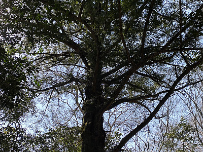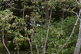 높이 25m, 지름 2m에 달한다. 수피는 회갈색이며 줄기가 사방으로 퍼지고 노목의 것은 얕게 갈라져 떨어진다. | |