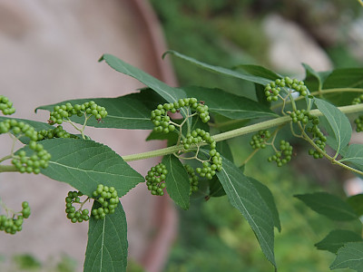 열매는 둥글며 지름 4-5㎜로서 보라빛의 반짝이는 구슬같고 10월에 자주색으로 익으며 여러개씩 뭉쳐서 액생한 채 오래도록 남아 있다. | ||