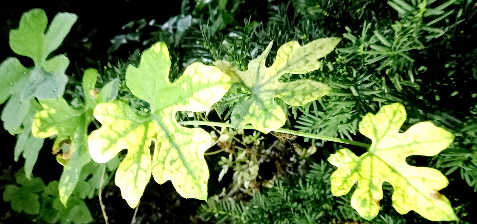 잎은 호생하며 단풍잎처럼 5-7개로 갈라지고 각 열편에 톱니가 있으며 밑부분이 심장저이고 표면에 짧은 털이 있다. |