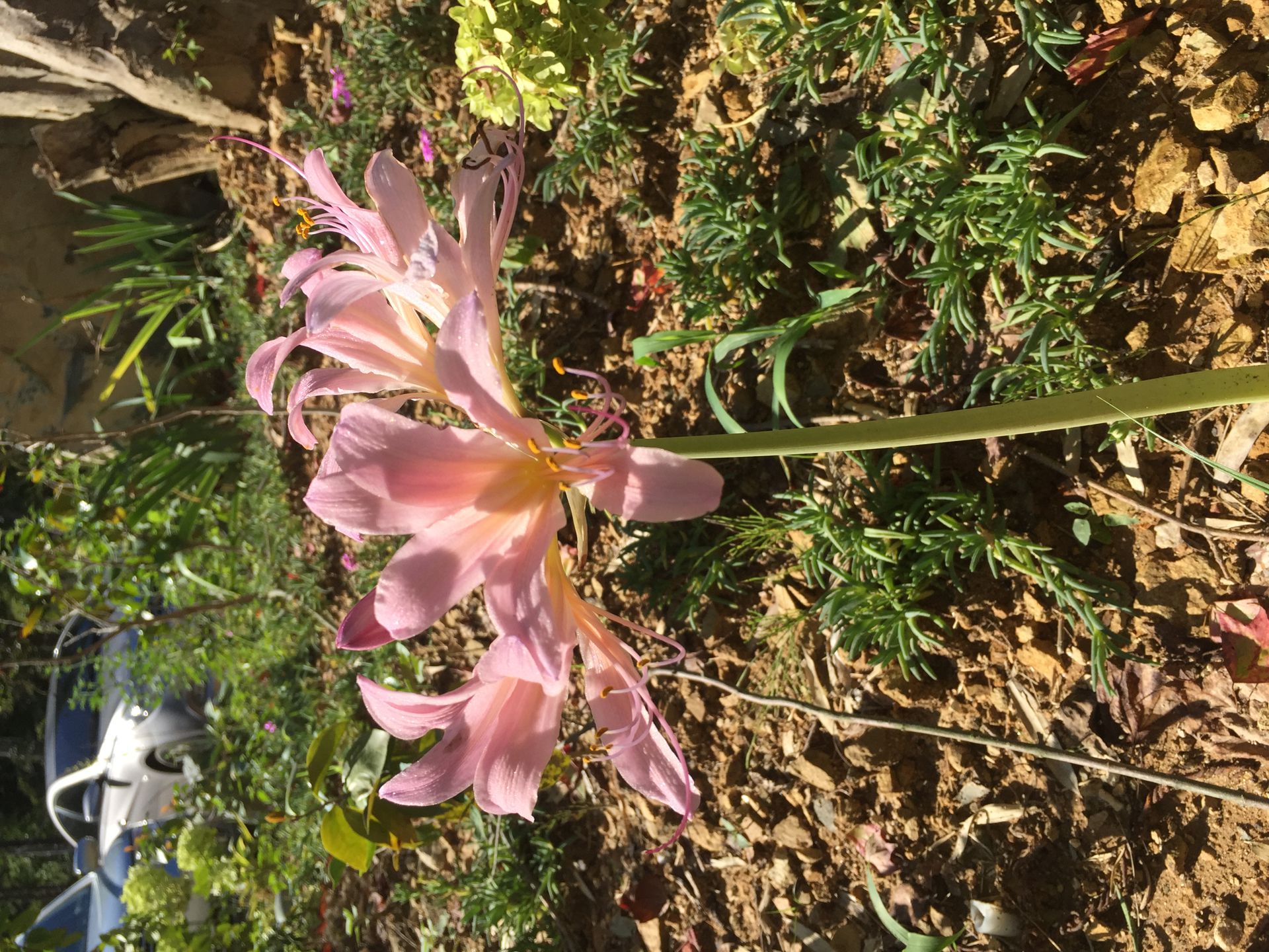 꽃 | 8월에 화경(花莖)이 나와 길이 60㎝정도 자라며 끝에 4-8개의 꽃이 달린 산형화서가 발달한다. 총포는 길이 2-4㎝로서 넓은 피침형이고 소화경은 길이 1-2㎝이며 꽃은 길이 9-10cm이고 통부는 길이 2.5cm로서 연한 홍자색이다. 화피열편은 6개이며 폭 15mm로서 비스듬히 퍼지고 수술은 6개이며 꽃밖으로 나오지 않는다. 자방은 하위이고 3실이며 열매를 맺지 못한다. |
