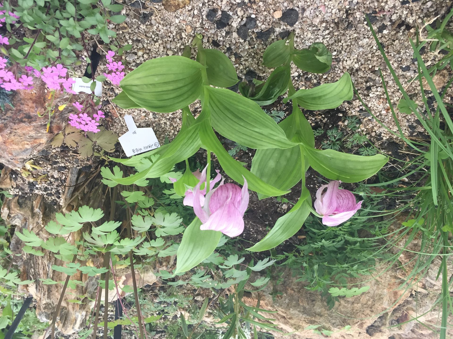 꽃은 5-7월에 피고 원줄기 끝에 1개씩 달리며 길이 4-6㎝이고 연한 홍자색이며 포는 잎과 같고 길이 7-10㎝이다. 상부의 꽃받침조각은 난형이며 길이 4-5㎝이며 끝이 뾰족하고 하부의 꽃받침조각은 서로 붙어있으며 끝이 2개로 갈라진다. 꽃잎 중에서 2개는 난상 피침형이며 끝이 뾰족하고 안쪽 밑부분에 털이 약간 있으며 순판은 길이 3.5-5㎝로서 큰 주머니 모양이며 안쪽에 긴 털이 산재한다. | ||