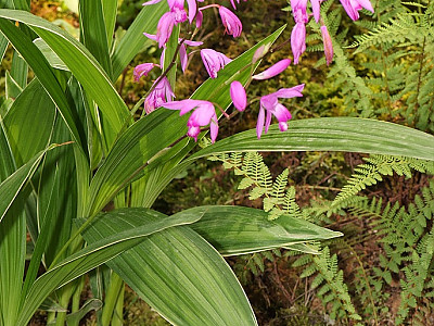 5-6월에 잎 사이에서 화경(花莖)이 나와 50㎝ 정도 자란 다음 6-7개의 홍자색 꽃이 총상으로 달린다. 포엽은 길이 2-3㎝로서 꽃이 피기전에 1개씩 떨어진다. 꽃은 지름 3㎝이며 화피열편은 같은 형태로서 길이 2.5-3㎝, 나비6-8mm이고 끝이 뾰족하며 비스듬히 반 쯤 벌어지고 맥이 있다. 순판은 쐐기 비슷한 도란형이며 가장자리가 악간 안쪽으로 말리고 윗부분이 3개로 갈라지며 중앙부의 것은 거의 둥글고 가장자리가 파상으로서 안쪽에 5개의 도드라진 능선이 있으며 암술대는 길이 2㎝정도이다. | |