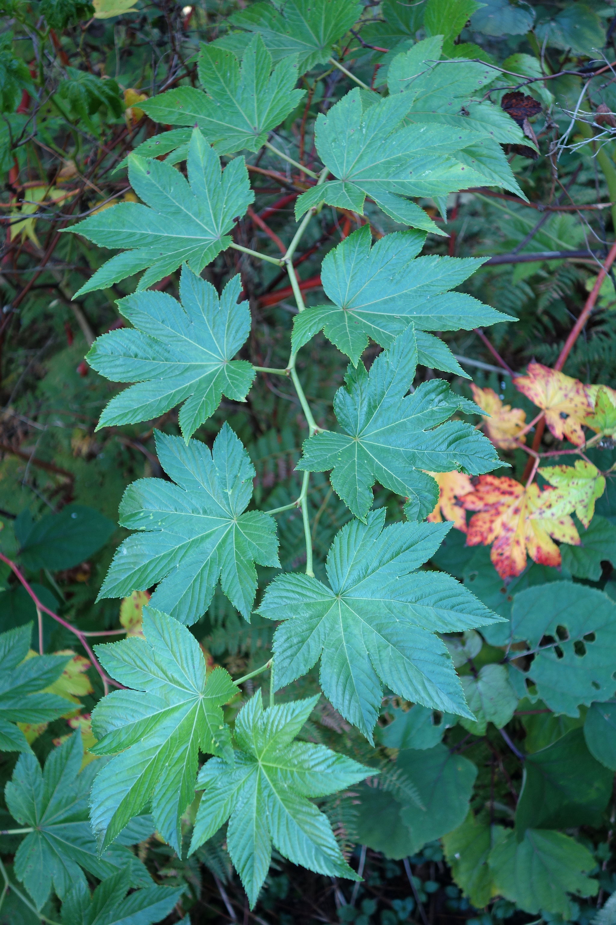 잎은 삼각상 난형이며 길이 5-7cm, 폭 4-6cm로서 양면 또는 맥 위에 짧은 털이 있고 예두 또는 짧은 예첨두이며 심장저 또는 절저이고 3-5중열(中裂) 또는 천열(淺裂)되며 불규칙한 톱니가 드문드문 있다. 엽병에 선모(腺毛)가 있다. |