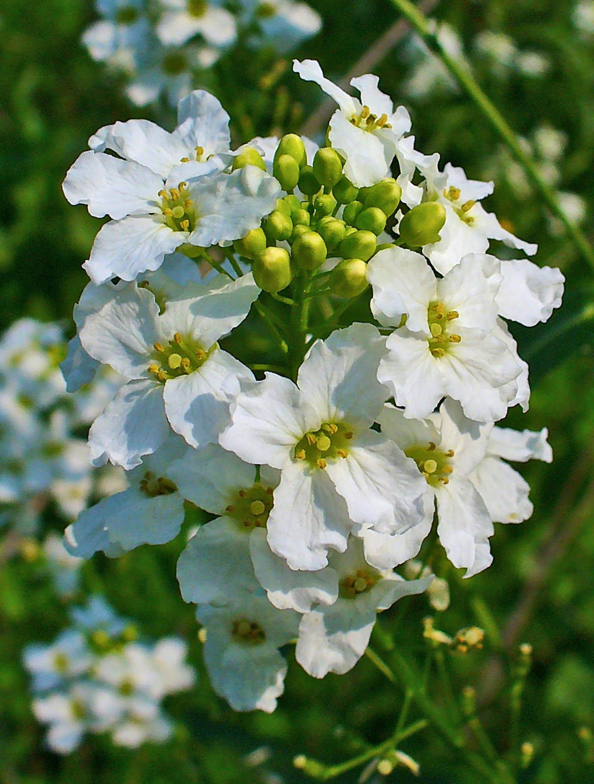 화경은 높이 70cm정도로서 잎이 달린다. 꽃은 5월에 피고 백색이며 화서는 윗부분의 엽액과 끝에 달리고 잎같은 포가 있다. | |
