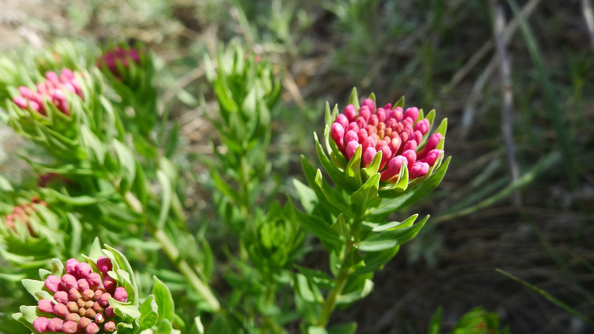 양지바른 벌판 또는 들판에 매우 드물게 자라는 여러해살이풀이다. 뿌리는 굵고 땅속으로 깊게 뻗어 들어가며 목질화된다. 줄기는 뿌리에서 여러 대가 모여나고 높이 20~40cm 정도로 자라며, 털이 없고 윤기가 있다. 잎은 어긋나며 다닥다닥하게 달린다. 잎몸은 피침형으로 길이 1.7~3.0cm, 폭 0.4~0.9cm이고 가장자리는 밋밋하다. 잎자루는 거의 없거나 매우 짧다. 꽃은 6~7월에 피는데 줄기 끝에서 20~25개가 머리모양꽃차례를 이루어 달리며 붉은색이다. 꽃받침통은 길이 8~12mm, 꽃받침 갈래는 5개, 수술은 10개다. 열매는 수과로 타원형이다. 한반도 제주도와 황해도 이북에 자생한다. 세계적으로 중국, 몽골, 러시아 등에도 분포한다. 줄기를 약용한다.
