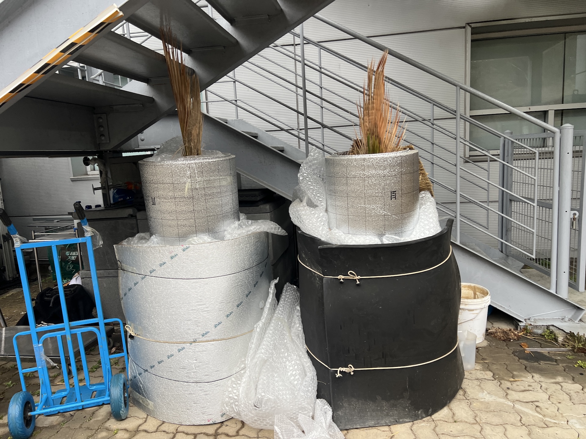노지에 식재하지 않아도 화분통채로 보온을 해서 실외에서 월동시키고 있는 워싱턴야자 두그루
