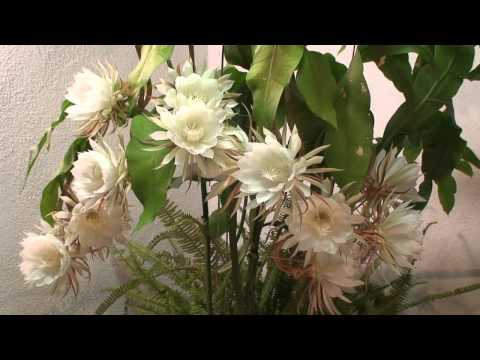 공작선인장속의 한 원종으로서 높이 1∼3m이다. 원줄기는 원기둥 모양이며 연한 녹색이고 납작하며 나비 10cm 이상 되기도 한다. 꽃은 6∼9월에 가지 가장자리에서 피는데, 저녁 8시부터 피기 시작하여 아침에 시들며 향기로운 냄새가 난다. 꽃은 길이 약 25cm, 지름 약 12cm이다. 빛깔은 흰색이지만 겉은 붉은빛이 돈다.