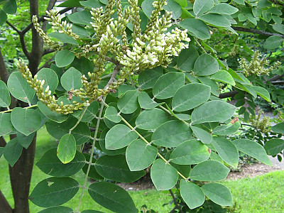 잎은 호생하며 기수1회우상복엽이다. 소엽은 9-11개이고 타원형 또는 긴 난형이며 짧은 점첨두이고 원저이며 길이 5~8cm로서 양면에 털이