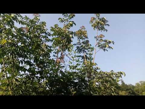 꽃은 잡성화 또는 암수딴그루로서 8월에 백색으로 피고 길이 4~5mm로서 향기가 적으며 가지끝에 길이 7-8cm의 취산화서에 달린다. 꽃받침잎은 짧으며 꽃잎은 길이 3mm로서 안쪽에 털이 있고 안으로 굽는다. 헛수술은 5개이며 자방은 꽃잎보다 약간 짧고 암술대가 5개이다. | |