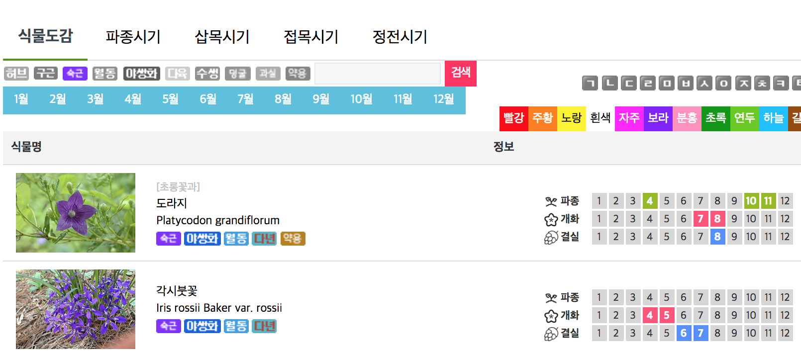 식물도감리스트에서 숙근식물을 체크하면 숙근식물만 검색이 되고 도감리스트나 식물상세정보에서 숙근식물인 경우 아이콘으로 표시됩니다.