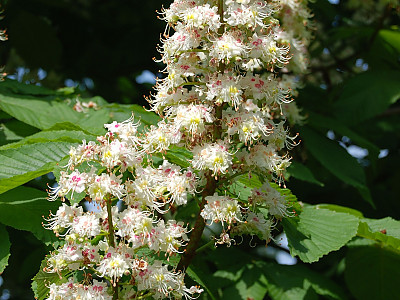 원추화서는 가지 끝에 달리고 길이 15-25cm, 지름 6-10cm로서 짧은 퍼진 털이 있으며 꽃은 잡성으로서 5-6월에 분홍색을 띤 백색으로 피고 밀생한다. 수꽃에 7개의 수술과 1개의 퇴화된 암술이 있으며 양성화는 7개의 수술과 1개의 암술이 있다. 꽃받침은 종형으로서 불규칙하게 5개로 갈라지고 꽃잎은 4개로 갈라진다. | |